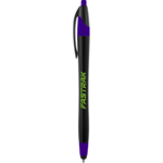 The Cougar Color Pop Ballpoint Stylus Pen features a painted black barrel with color accents. Rubberized stylus. Retractable ballpoint with black ink cartridge. Licensed under U.S. Pat. Nos. 8,847,930 and 9,092,077