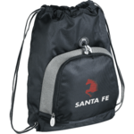 Open main compartment with cinch top. Zippered front pocket with earbud port access and mesh organization. Grommet reinforced drawstring design for over-the-shoulder or backpack carry. Signature Slazengerâ„¢ hardware and logo.